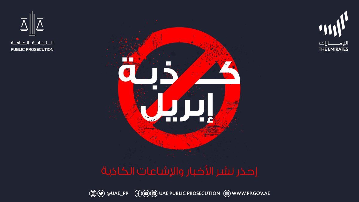 دادستانی ایالت از شهروندان اماراتی خواست تا طریق حساب های خود در شبکه های اجتماعی نسبت به انتشار شایعات دروغ و ایجاد شوخی هایی که به جامعه خسارت وارد می کند، اقدام نکنند. این مرجع قضایی از شهروندان خواسته است به بهانه "دروغ آوریل" زیر بار مسئولیت قانونی نروند.