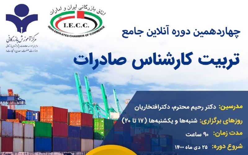 مرکز آموزش بازرگانی با همکاری اتاق بازرگانی ایران و امارات چهاردهمین دوره آنلاین جامع تربیت کارشناس صادرات را برگزار می کند.